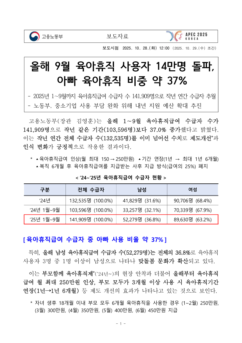 2025년 9월 육아휴직급여 통계 및 26년 일가정양립 지원방안