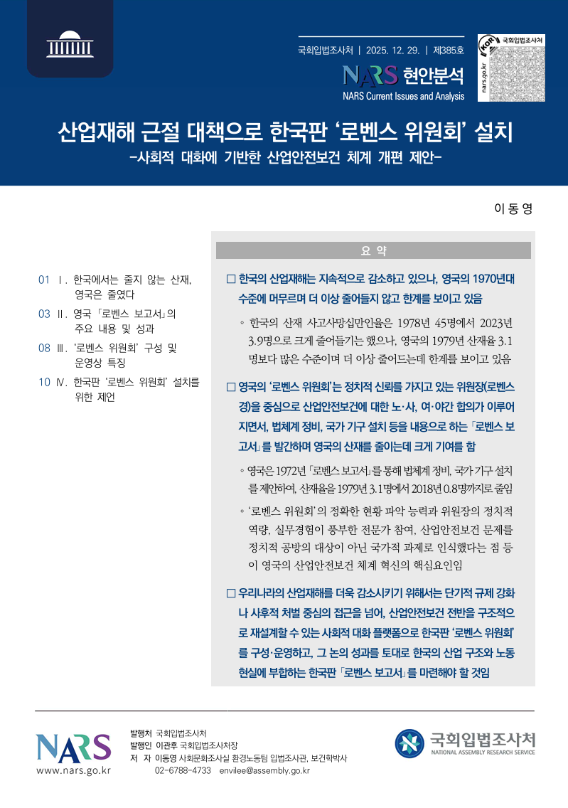 산업재해 근절 대책으로 한국판 ‘로벤스 위원회’ 설치