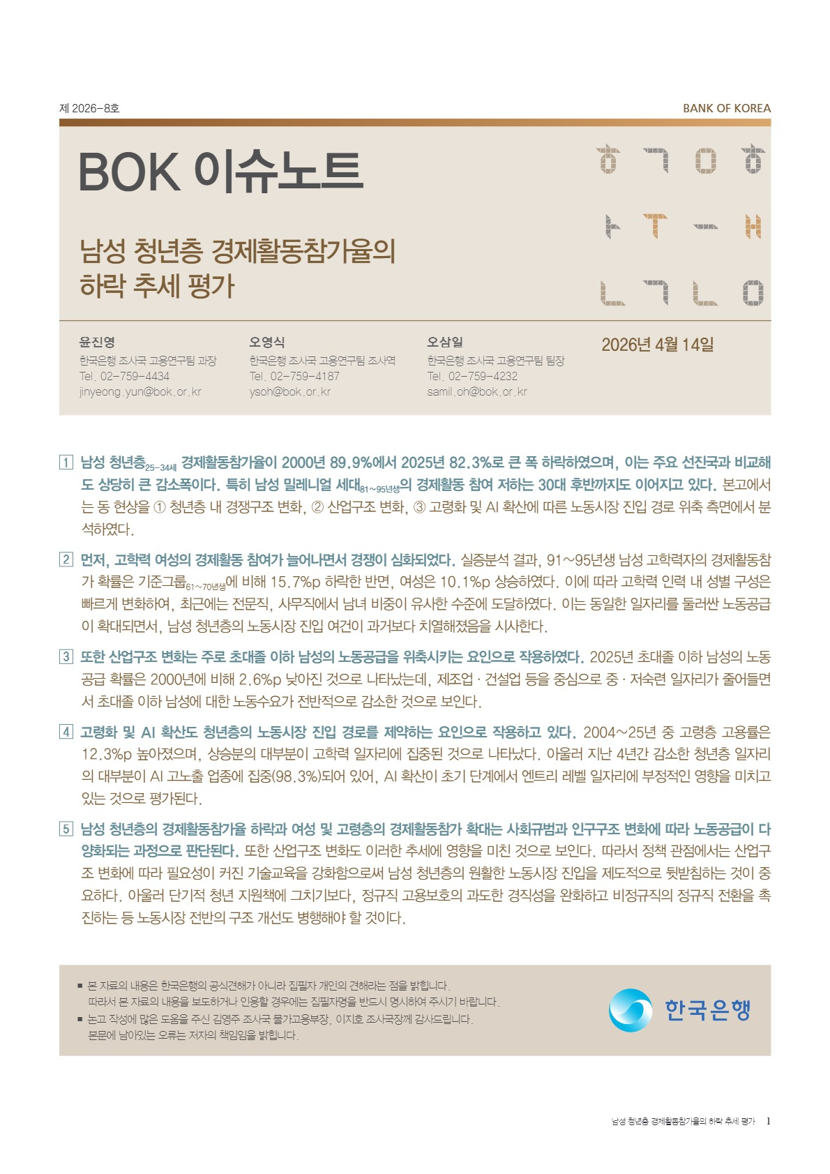 남성 청년층 경제활동참가율의 하락 추세 평가