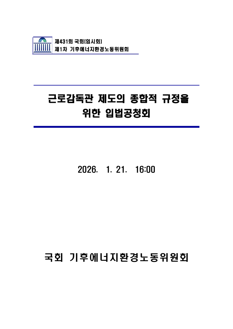 | 노동 형태 변화에 따른 노동약자 및 일하는 사람 보호 관련 법률안에 관한 입법공청회 |  | 근로감독관 제도의 종합적 규정을 위한 입법공청회 |